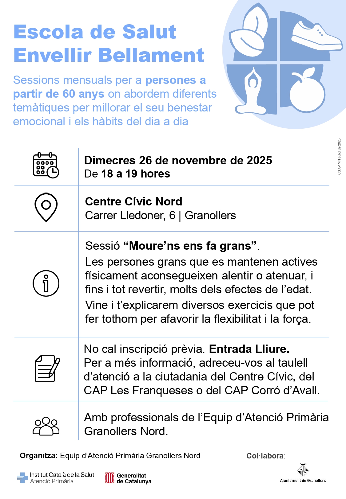 Sessió “Moure’ns ens fa grans”. Les persones grans que es mantenen actives físicament aconsegueixen alentir o atenuar, i fins i tot revertir, molts dels efectes de l’edat.