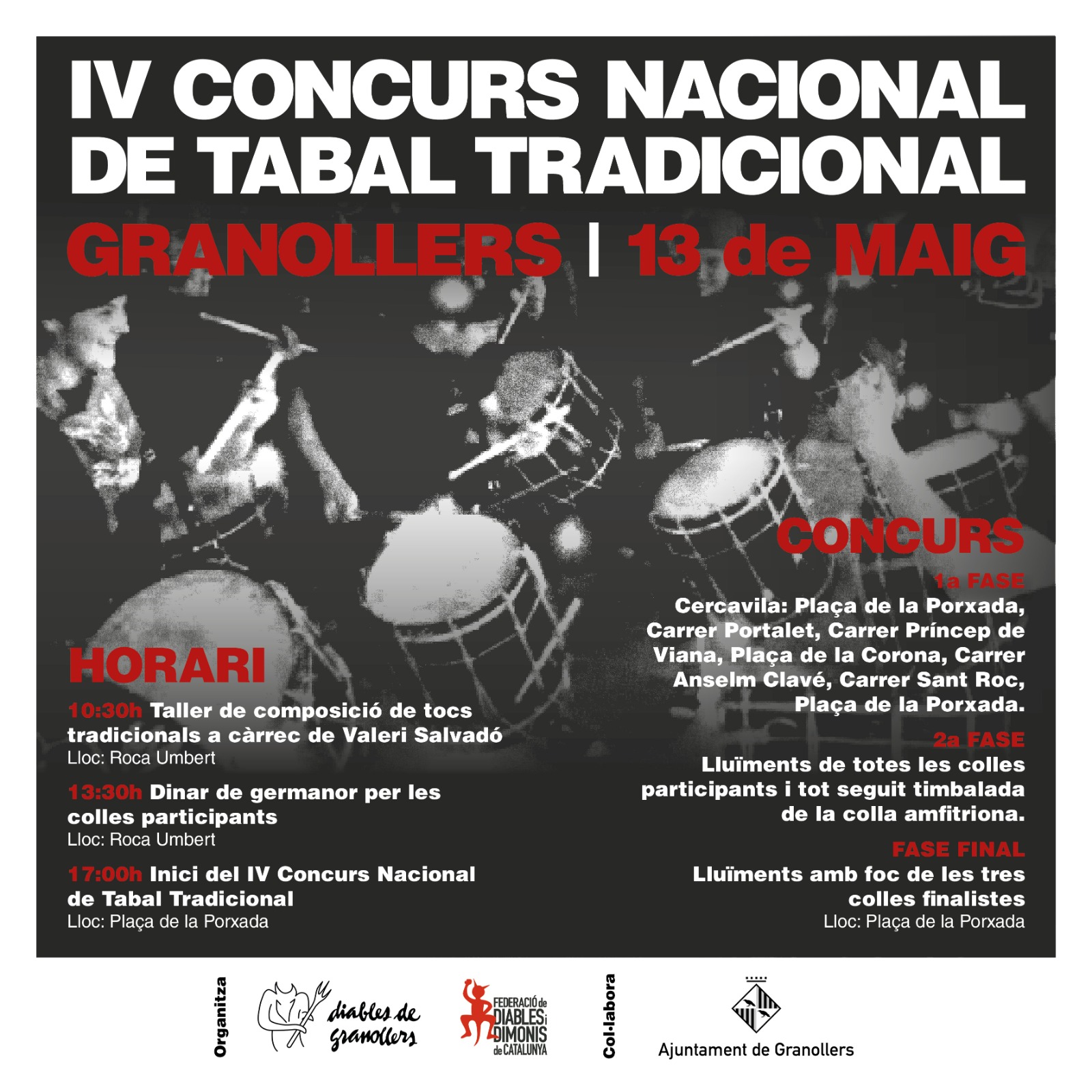 La jornada començarà a les 10:30h a la Roca Umbert amb un taller de composició de tocs tradicionals a càrrec de Valeri Salvadó. Al migdia, a les 13.30 h, es farà un dinar de germanor amb les colles participants, i a les 17:00h començarà el concurs a la Plaça de la Porxada.