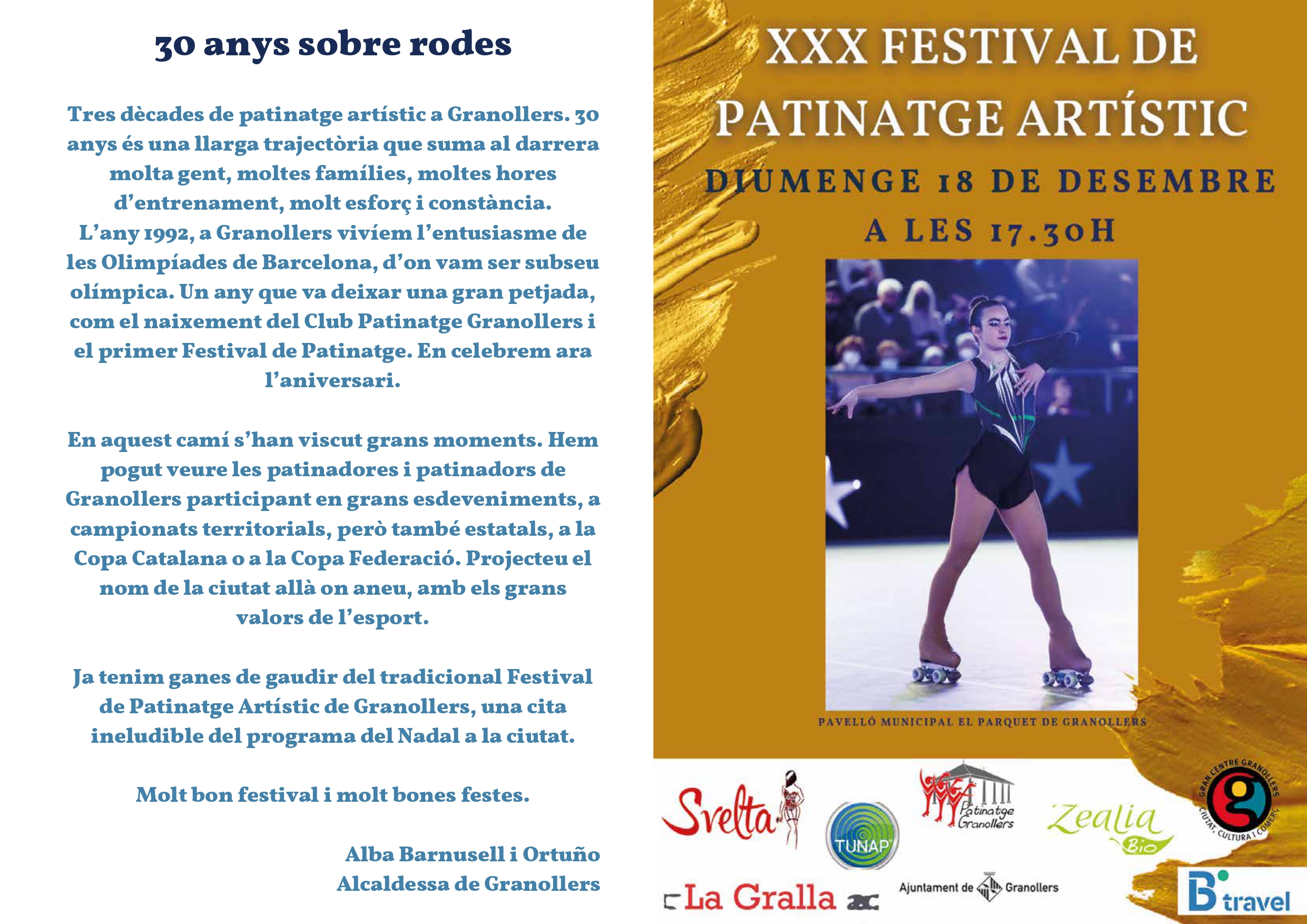 Tres dècades de patinatge artístic a Granollers. 30 anys és una llarga trajectòria que suma al darrera molta gent, moltes famílies, moltes hores d’entrenament, molt esforç i constància. L’any 1992, a Granollers vivíem l’entusiasme de les Olimpíades de Barcelona, d’on vam ser subseu olímpica. Un any que va deixar una gran petjada, com el naixement del Club Patinatge Granollers i el primer Festival de Patinatge. En celebrem ara l’aniversari.