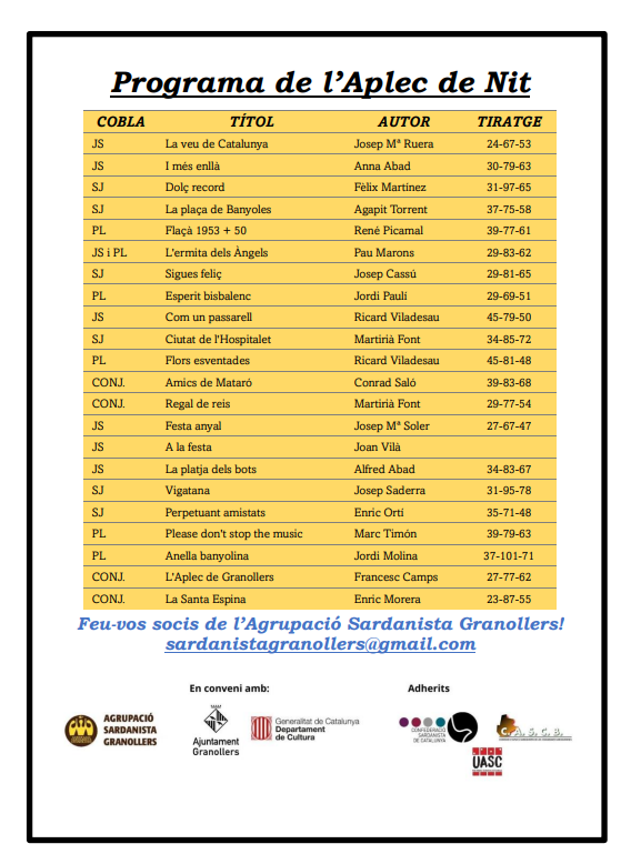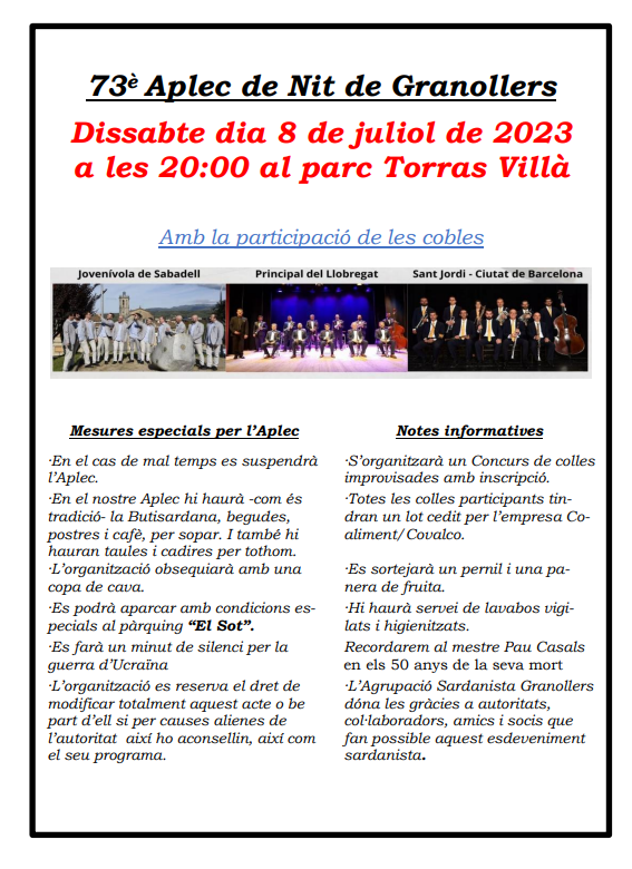 73è Aplec de la Sardana (Aplec de Nit) amb les cobles Principal del Llobregat, Sant Jordi-Ciutat de Barcelona i Jovenívola.