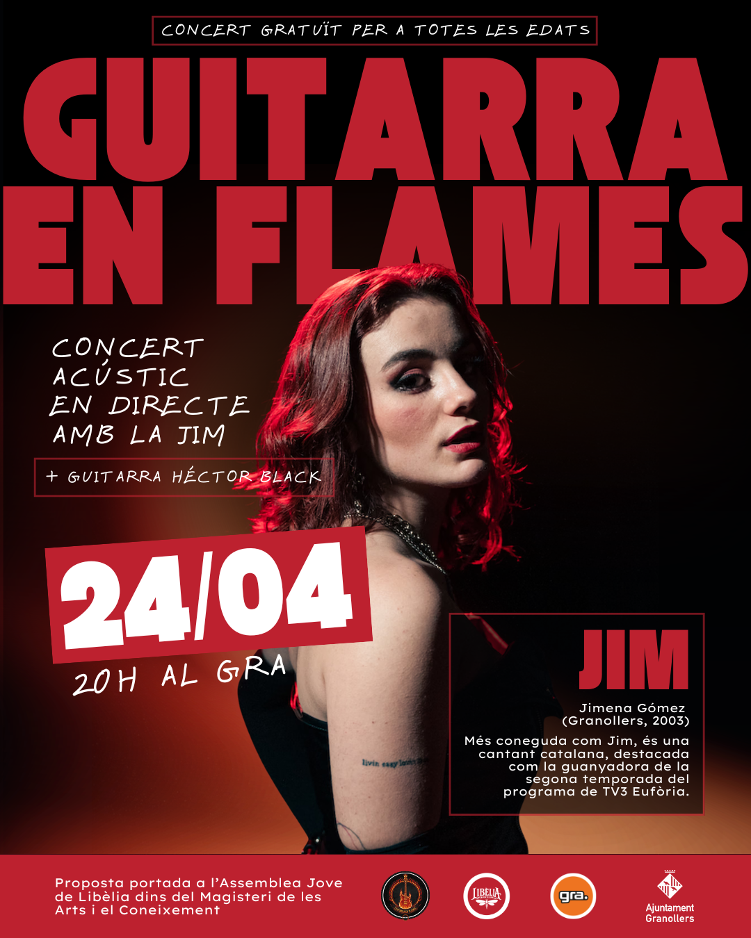 La iniciativa “Guitarra en flames” neix de l’Assemblea Jove de Libèlia. Va ser proposada i votada per joves de Granollers dins del Magisteri de les Arts i el Coneixement, amb l’objectiu de potenciar el català a través de la música i el talent local.