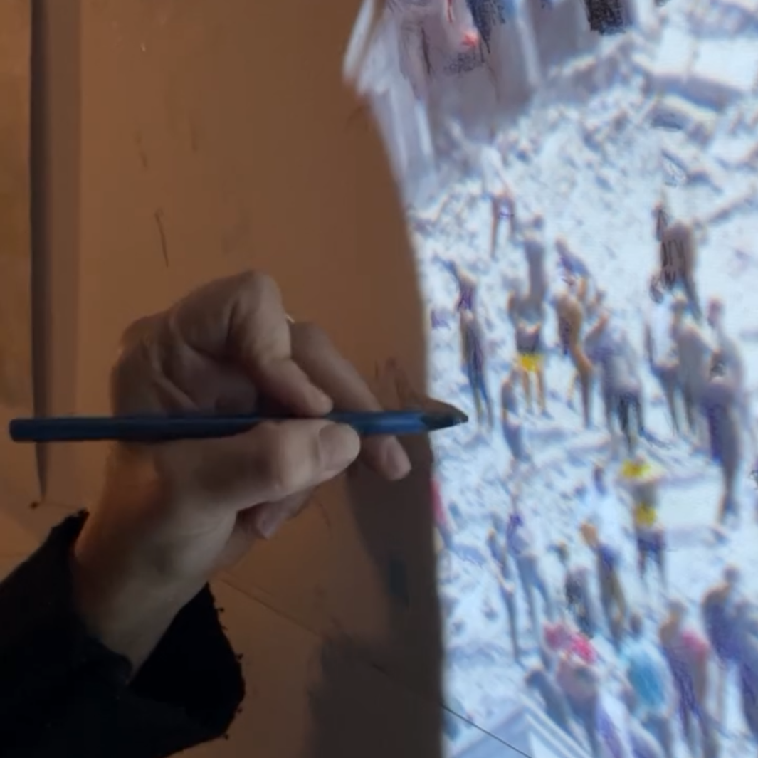 Com a part de la seva residència, l'artista Glòria Giménez ens proposa obrir el seu taller a l'Espai d'Arts de Roca Umbert per compartir el seu procés artístic i convidar al públic a col·laborar amb ella en la creació de la seva propera obra sobre paper. Les peces de la Glòria es creen en la foscor amb l'ajuda d'un projector. L'artista, parteix de la fotografia projectada per fer-ne una traducció amb llapis de colors que li permet apropar-se a l'escena representada no des de la immediatesa, sinó des del temps que requereix el dibuix sobre paper.