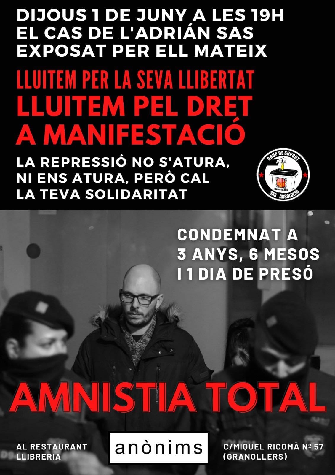 El Grup de Suport Sas Absolució fa pressió perquè es desestimin els 3 anys, 6 mesos i un dia de presó contra el jove vilafranquí Adrián Sas, condemnat arran dels aldarulls registrats durant el primer aniversari del referèndum del Primer d’Octubre de 2017 davant del Parlament.