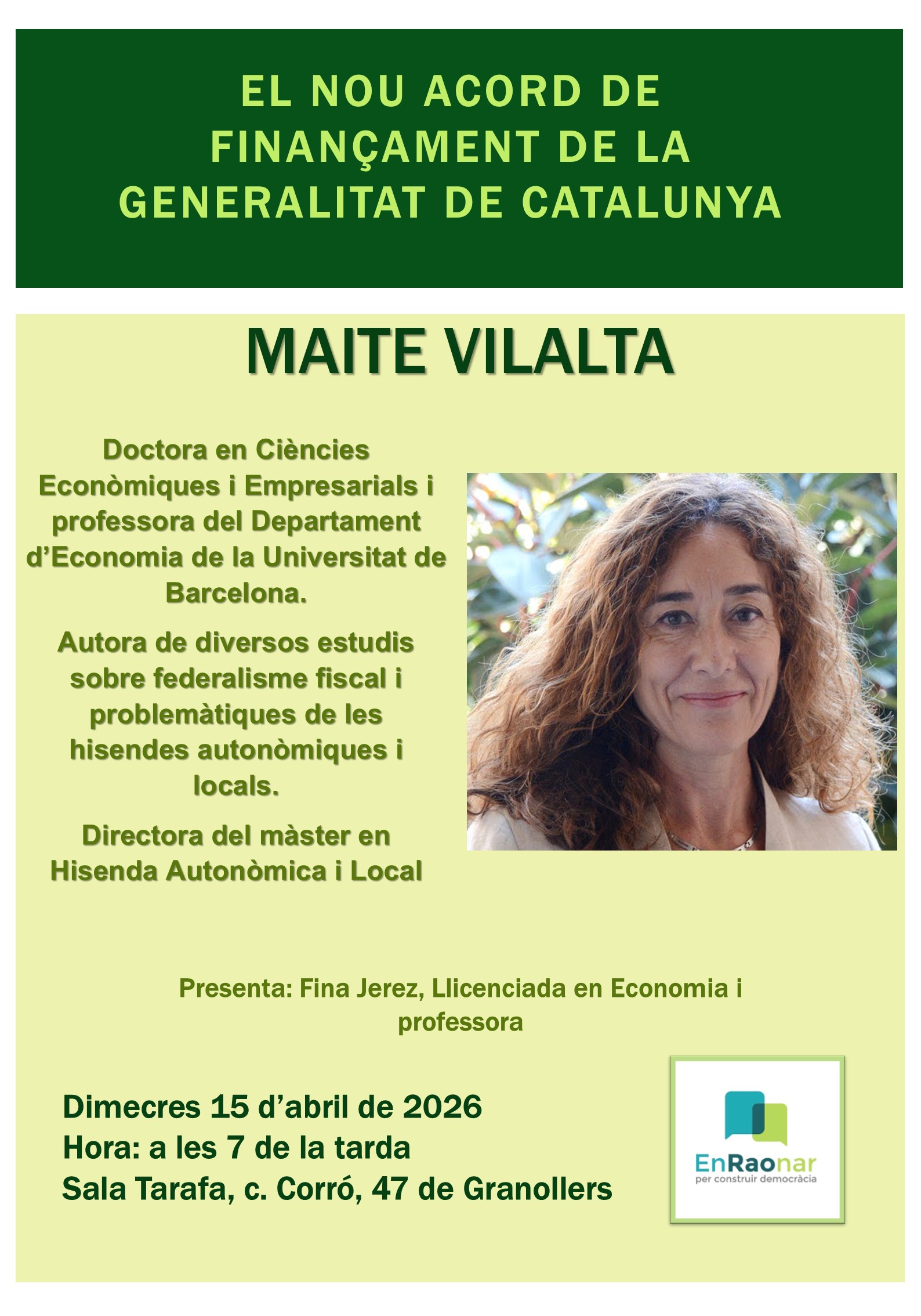La doctora en Ciències Econòmiques i Empresarials Maite Vilalta oferirà una xerrada centrada en el nou acord de finançament de la Generalitat i les seves implicacions econòmiques.
