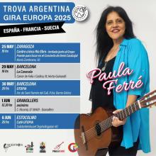 PAULA FERRÉ Trobadora de Buenos Aires i gestora de projectes col·lectius. Ha representat a l'Argentina a l'Equador, el Perú, Costa Rica, Cuba, el Brasil, Xile i Espanya. Alhora ha recorregut gran part del nostre país amb la seva cançó social. Una de les fundadores de MUJERTROVA en 2013, que avui reuneix més de 70 trovadores de tota Llatinoamèrica. Els seus discos “Per Buenos Aires”, “Una guitarra, un somni i una veu”, “Dona Originària”, amb aquest últim va rebre el premi CANÇÓ IMPRESCINDIBLE a l'Equador en 2012. I va ser declarat d'Interès Cultural per l'Honorable Cambra de Diputats de la Nació en 2015. En 2019 va editar “Umbilical”, al costat de la seva mare i la seva filla. Fa 30 anys que està al costat de la Troba cantant amb destacats trobadors llatinoamericans, com Silvio Rodríguez, Vicente i Santiago Feliú, León Gieco, Víctor Heredia, Cecilia Todd, Teresa Parodi, Horaci Fontova, Ignacio Copani, entre altres. Va ser una de les organitzadores de CANTO DE TOTS 2015 en el Teatre Cervantes amb músics de tota Llatinoamèrica. Paula Ferré és la directora de La Casa Museu de La Troba a l'Argentina. En el 2017/2018 i 2019 va formar part del disc homenatge a Violeta Parra “Després de viure un segle”. Actualment, treballa sobre dos discos “Coloms del Bé, Paula Ferré canta a Humberto Del Mont Mar” i “Trovablues”. En el 2019 va gravar al costat de Silvio Rodríguez la seva cançó Dona Originària, amb imatges del documentalista Martín Adorno, qui a més va incloure la cançó en la seva pel·lícula MILAGRO. Va rebre el suport de BAMUSICA tant per a la presentació del seu disc Umbilical com per a la de Trovablues, de manera virtual a la Ciutat de Buenos Aires. Va participar del Festival Internacional Som Antídot del EFAC de manera virtual, al costat de reconeguts artistes. En 2020 va rebre el premi IBERMUSICAS per a realitzar una gira per Panamà i Cuba que es va concretar a fins de 2022. En la seva gira per Cuba 2022, ha rebut la Medalla pel 50 Aniversari del Moviment de la Nova Trova i va participar al costat de Silvio Rodríguez d'una trobada en l'Estudi Tant de bo a l'Havana. A Panamà va fer 4 concerts, entre ells un en el Ministeri de Cultura. Durant la seva gira Europa 2023 va ser convidada a participar del Festival Barnasants a Barcelona, I Trobada de la Cançó d'autor, a Galícia i Festival Abril Per a Viure a Granada. A més ha fet concerts i tallers a les ciutats de Bilbao, Corunya, Madrid, Saragossa i Santiago de Compostel·la. Al setembre 2023 a Cuba va participar de la sisena edició de la Trobada “Ella i Jo” a l'Havana, al costat d'integrants del Moviment Mujertrova que va complir deu anys en els escenaris i de la XXV Trobada Internacional de la Tropa Còsmica en Santa Clara, Cuba. Va ser nominada als Premis Mercedes Sosa a Millor cantautora 2023. En 2024 va realitzar la seva tercera gira per Europa presentant-se en el Festival de la Cançó d'autor de Barcelona “Barnasants” i en 11 ciutats.