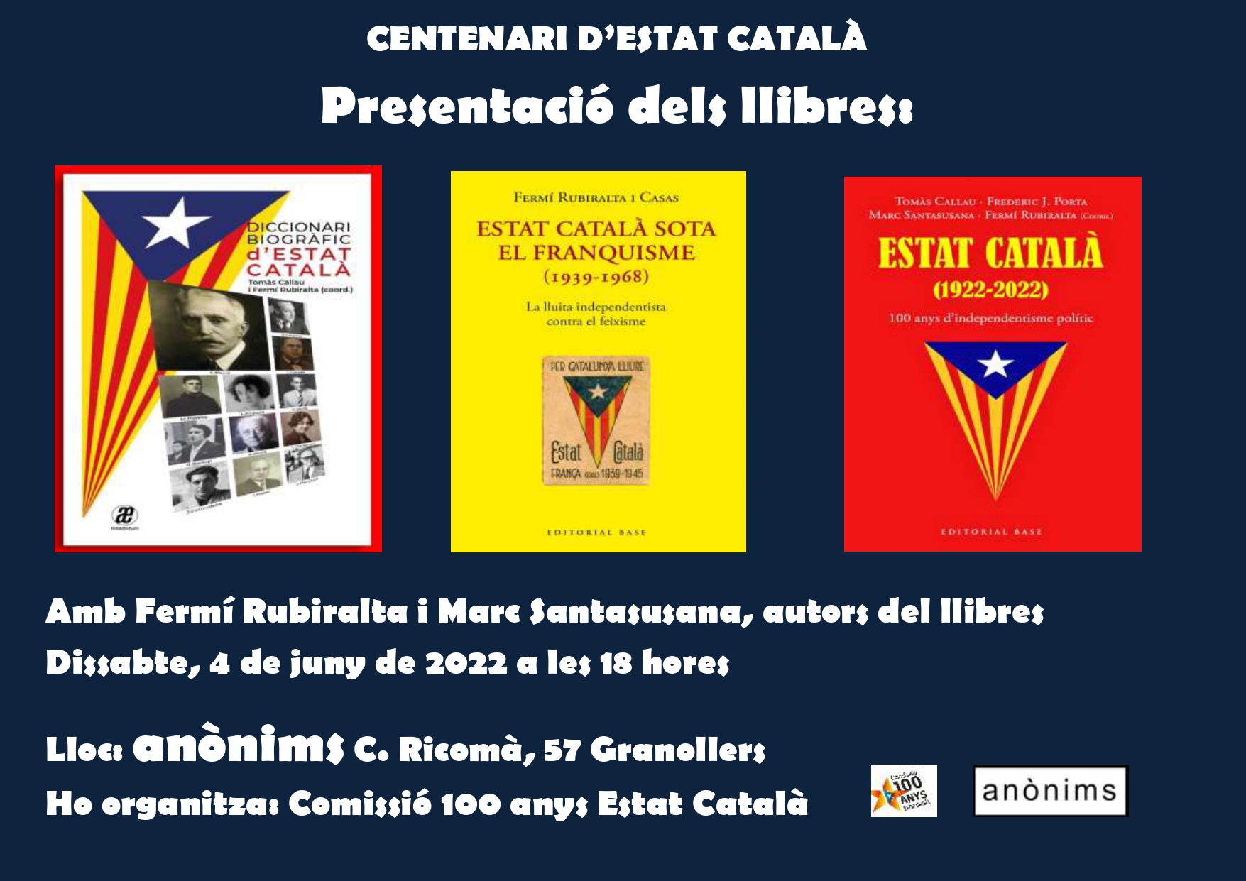 Ho organitza: Comissió 100 anys Estat Català. Comissió 100 anys d’Estat Català, formada per la Fundació Reeixida, Estat Català, historiadors, familiars d’integrants de l’organització, militants de l’independentisme combatiu, i activistes .