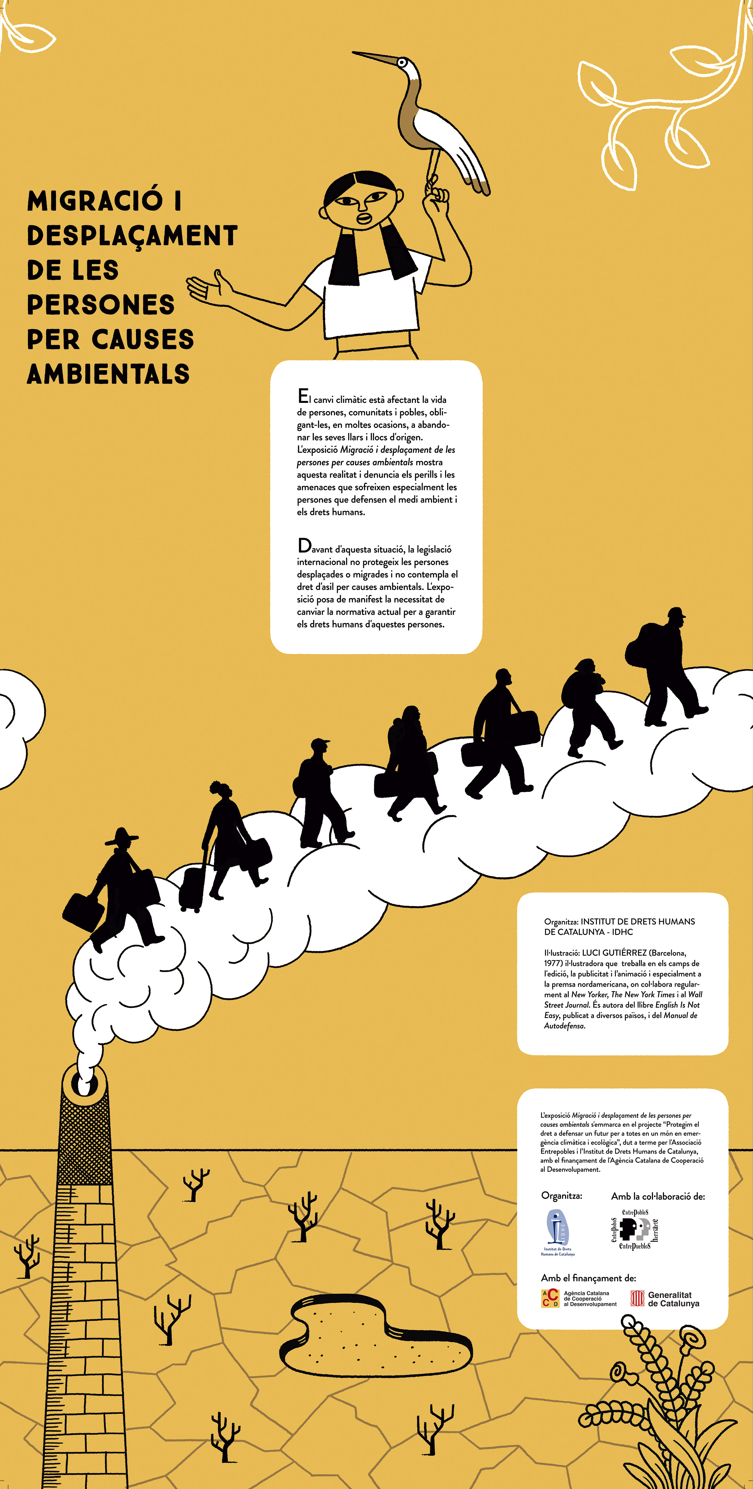 El canvi climàtic està afectant la vida de persones, comunitats i pobles, obligant-les, en moltes ocasions, a abandonar les seves llars i llocs d'origen. Mitjançant acolorides il·lustracions, l'exposició Migració i desplaçament de les persones per causes ambientals mostra aquesta realitat i denuncia els perills i les amenaces que pateixen especialment les persones que defensen el medi ambient i els drets humans.