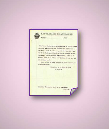 Aquest Document del mes de l'Arxiu Municipal de Granollers (AMGr) forma part de la sèrie 190. Correspondència, dins la secció Actes Protocol·laris i Relacions Externes del Fons Ajuntament de Granollers de l'AMGr. En aquesta sèrie, s'apleguen les cartes i els comunicats rebuts i enviats per l'Alcaldia en relació amb altres departaments de l'Ajuntament però, sobretot, amb institucions, organismes d'altres administracions i diferents entitats.