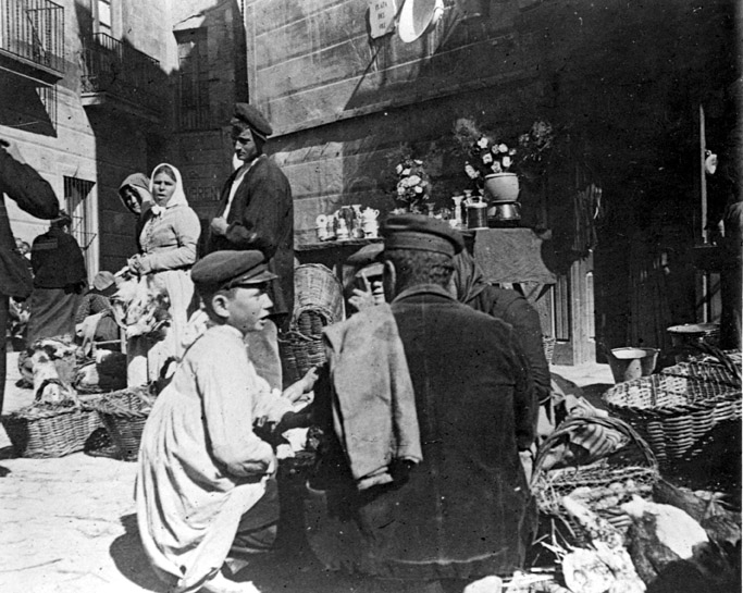 Mercat a la plaça de Maluquer i Salvador, ca. 1900. Autor i fons Tomàs Torrabadella / AMGr