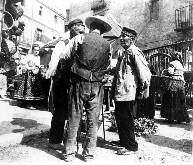 Mercat a la plaça dels porcs, ca. 1890. Autor i fons Tomàs Torrabadella / AMGr