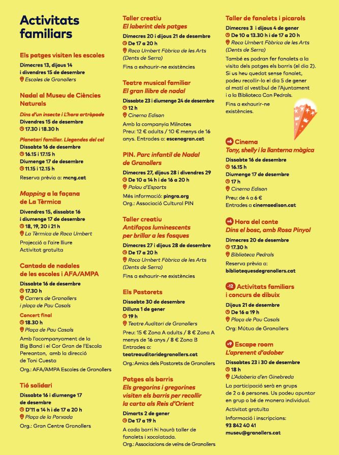 A diferents punts de la ciutat es podrà degustar el brou de Nadal: l’Associació de Veïns Granollers Centre tornarà a organitzar Les delícies del Nadal, el 16 de desembre amb l’escudella elaborada a la plaça de les Olles, amb l’olla soterrada de la mateixa plaça; al Centre Cívic Nord es farà el Caldo de Nadal de l’Associació de Veïns de l’Hostal i a la plaça Jaume I el Conqueridor, l’Escudella de Nadal de l’Associació de Veïns del Lledoner, els dos actes el dia 15 de desembre.