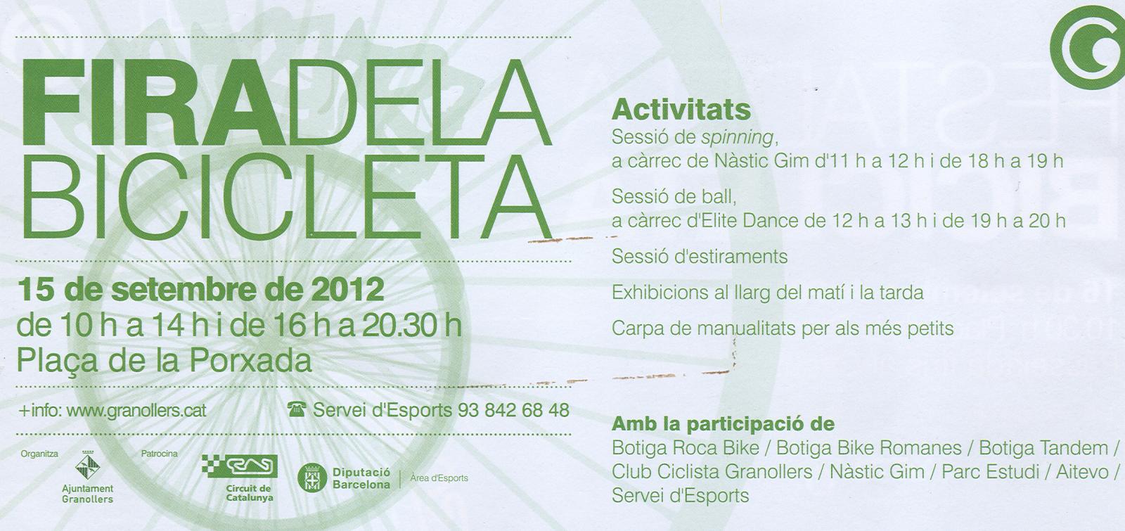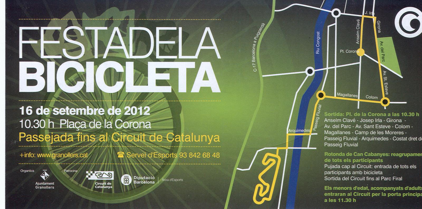 Tot a punt per a la celebració, un any més, de la Festa de la Bicicleta a Granollers. Aquest diumenge, 16 de setembre, amb l'habitual recorregut ciclista, a partir de les 10.30 h, des de la plaça de la Corona i fins al Circuit de Catalunya, on s'hi podran fer dues o tres voltes en bicicleta, segons les possibilitats de cadascú. Els infants menors de 8 anys podran arribar directament al Circuit en el vehicle d'algun adult, a les 11 h, per fer-hi el recorregut amb la seva bicicleta.