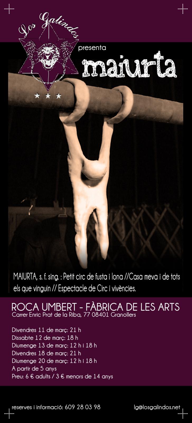 La companyia de circ Los Galindos instal·larà la seva carpa aquest mes de març a Roca Umbert Fàbrica de les Arts per oferir el seu darrer muntatge "Maiurta", un espectacle sobre els records i vivències d'un pallasso amnèsic. La companyia actuarà a Granollers per espai de cinc dies, alguns dels quals, amb funció doble (dia 11 de març, a les 21 h; dia 12, a les 18 h ; dia 13, a les 12 h i a les 18 h; dia 18, a les 21 h; i dia 20, a les 12 h i a les 18 h).