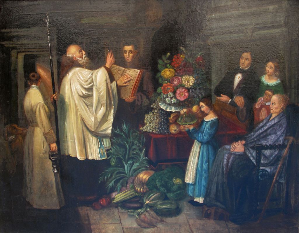 El quadre ara exposat relata una escena familiar al voltant d'una benedicció. L'acció té lloc dins una casa noble, aparentment d'àmbit rural, i retrata un frare beneint amb el salpasser els béns i fruits de la terra davant tota la família reunida. Aquesta tradició entronca amb el Salpàs, la benedicció de les cases amb aigua i sal que tenia lloc per Pasqua. La pintura se situa cap al 1830, tenint en compte la indumentària, que encaixa perfectament amb la moda romàntica.