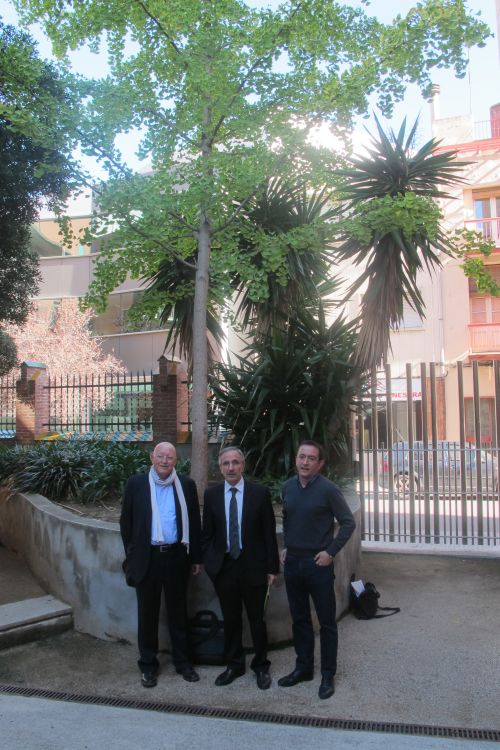 +El president i el gerent de la Fundació Viver de Bell-lloc amb l'alcalde de Granollers davant un gingko plantat a Can Jonch. Aquesta espècie va resistir al bombardeig atòmic