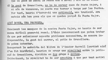 Així, el Document del Mes de setembre és la «Proposta alternativa. Festa Major de Granollers», que els mesos de maig-juny de 1983 presentaven a l’Ajuntament quatre joves que signaven com «Equip motor de la festa dels Blancs i els Blaus» i que fixava les bases de la celebració tal com avui la coneixem. El podeu llegir a: www.granollers.cat/arxiu
