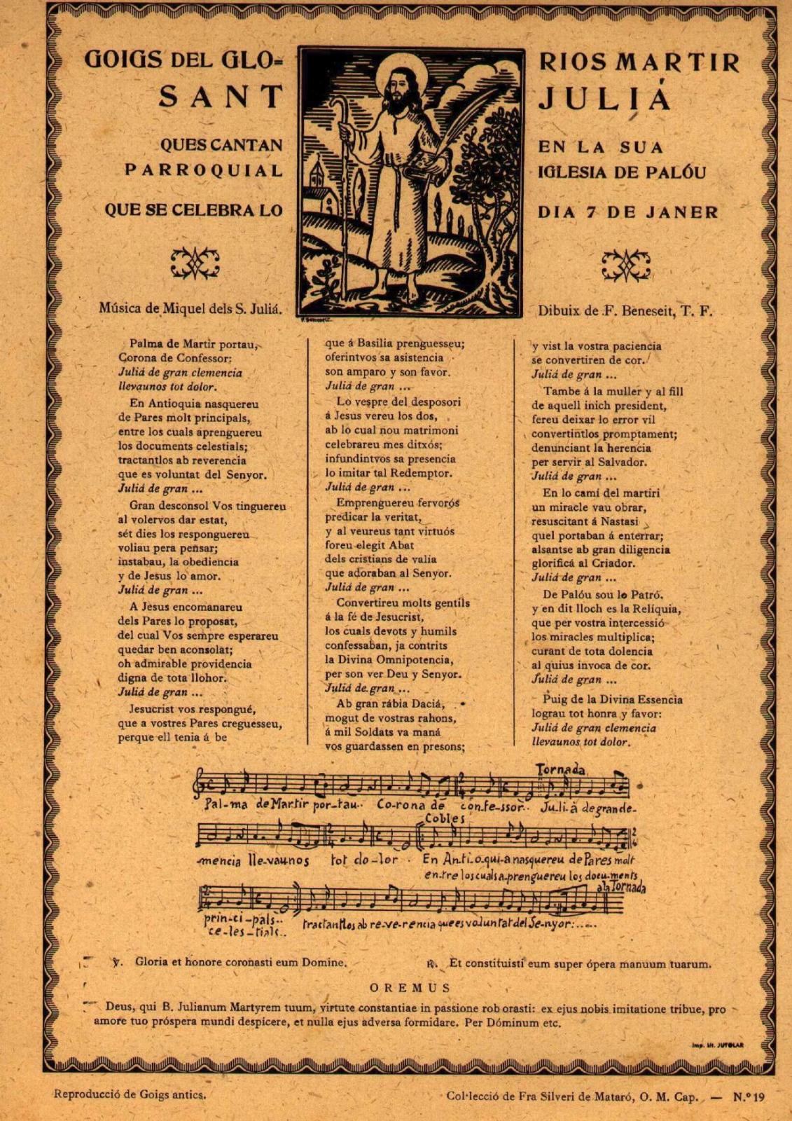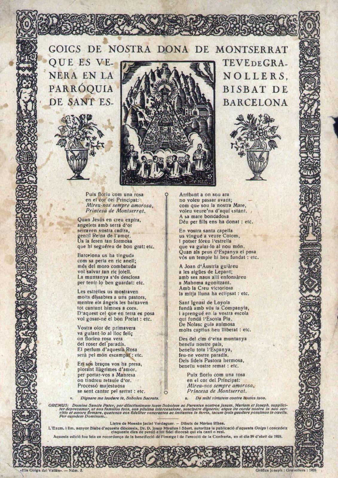 Altres goigs d’aquesta col·lecció lligats a Granollers són els dedicats a sant Julià, patró de Palou, i a la Mare de Déu de Montserrat, venerada a la parròquia de Sant Esteve, aquest últim, amb lletra de mossèn Cinto Verdaguer i que, tal com recull el peu del document editat l’any 1928, “concedeix cinquanta dies de perdó a tot fidel diocesà qui els canti o resi”.
