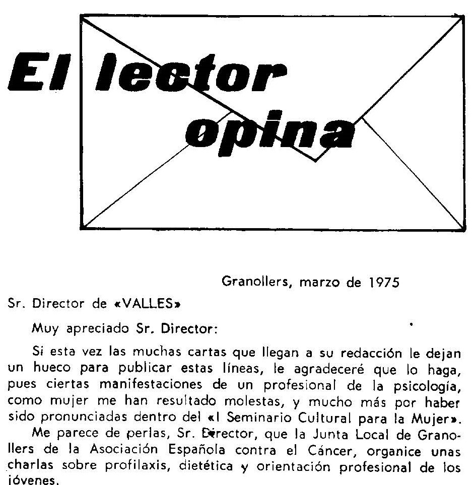 D’una banda, el Document del Mes de març dona a conèixer un text de Feli Miyares de l’any 1975 en què l’arqueòloga posa en valor l’aportació de les mestresses de casa a la societat, en resposta a unes manifestacions fetes en el marc del 1r Seminario Cultural para la Mujer organitzat aquell any per l’Asociación Española contra el Cáncer. En la carta, publicada a la secció «El lector opina» de la revista Vallés, l’autora també demanava la revisió de les lleis del Dret Comú que privaven la dona d’exercir «els drets més elementals». La carta forma part del Fons Josep Estrada i Feli Miyares i podeu llegir-la aquí.