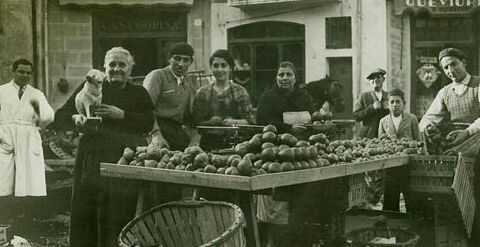 Parada de fruita al mercat del dijous, pl. de les Olles, anys 1930-35. Autor desconegut / Fons Col·lecció Josep Garrell i Soto/ AMGr