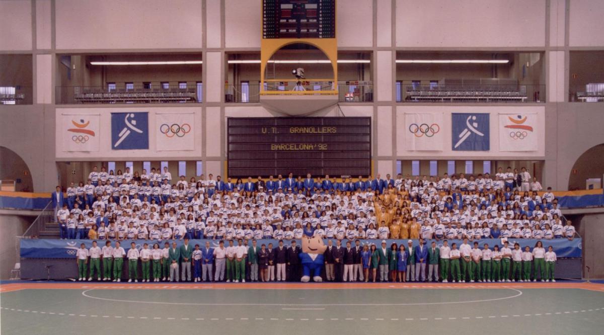 A la imatge següent, responsables i voluntariat dels Jocs Olímpics amb la mascota, Cobi, al Palau d'Esports de Granollers el 30 de juliol de 1992 / Autor: Ramon Ferrandis / Fons Ajuntament de Granollers / AMGr