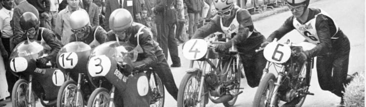 Són fotografies de curses, gimcanes i desfilades en què la moto té un paper central