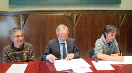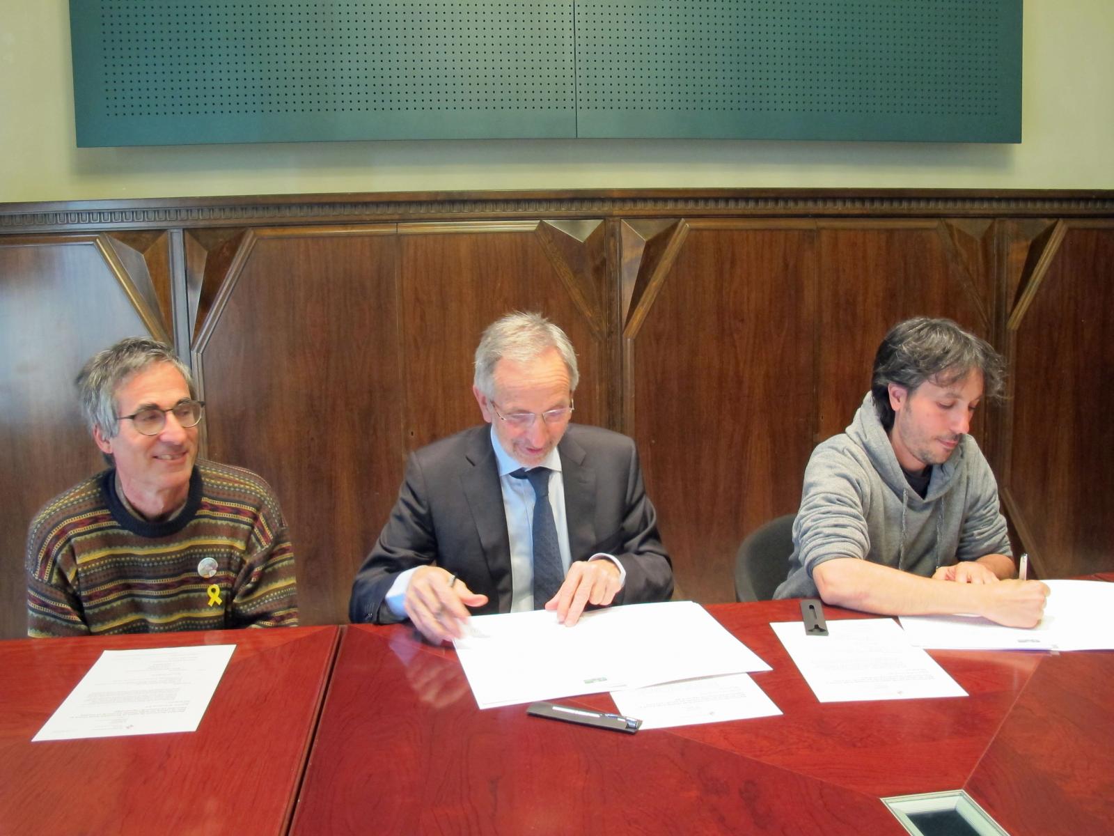 +Han signat el conveni Jonatan del Amo, per part de La Panotxa i Josep Mayoral, president del Patronat Municipal del Museu de Granollers, amb Toni Arrizabalaga, director del Museu de Ciències Naturals que acull el Banc de Llavors del Vallès Oriental