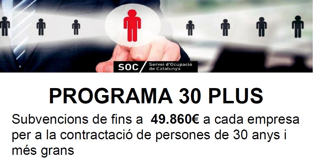 +L’Ajuntament de Granollers, a través del Servei Local d’Ocupació i EPE Granollers Mercat, participa en la cinquena edició del Programa 30 plus. Aquest programa, subvencionat pel Servei Públic d’Ocupació de Catalunya i pel Servicio Público de Empleo Estatal, ofereix subvencions de fins a 1108,33 € mensuals (equivalent al SMI, el salari mínim interprofessional) als contractes d’un mínim de 6 mesos de durada, adreçats a persones desocupades de 30 anys i més, i que incloguin la formació adient al lloc de treball.