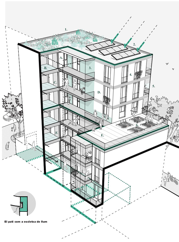 L’edifici comptarà amb zones comunitàries, coberta verda de baix consum hídric integrant el cicle de l’aigua en les necessitats de l’edifici, una terrassa d’ús compartit, i sistemes d’eficiència i estalvi energètic en la tria dels materials, en la tria de certs sistemes en sec, i en les solucions per a la façana i per a la pell de l’edifici. També es preveu el foment de la il·luminació i de la ventilació naturals o l’aprofitament de les aigües de pluja. Tots els habitatges tindran entre 70 i 75 m2 de superfície útil, disposaran de tres habitacions, dos lavabos i balcó-galeria. L’edifici comptarà amb un aparcament soterrat de més de 300 m2.