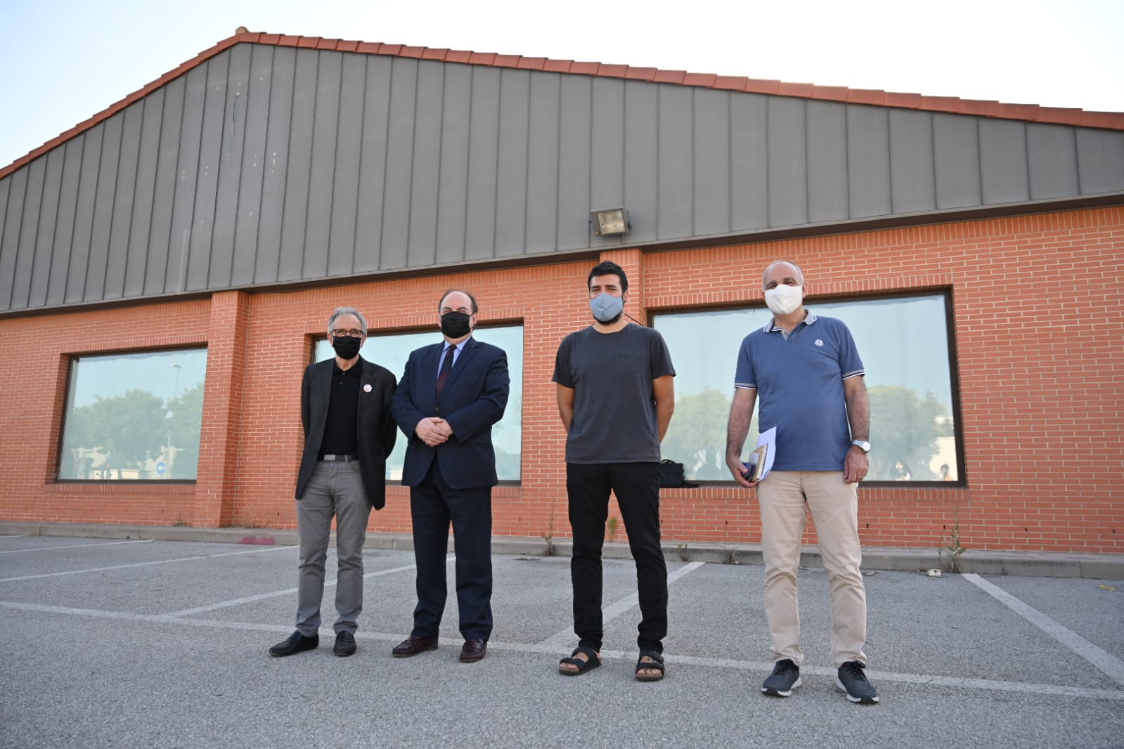 +Els representants municipals, l'alcalde, Josep Mayoral, i el rector de la UVic, Josep Eladi Baños, davant la nova nau de la futura seu d'UGranollers Foto: T.Torrillas