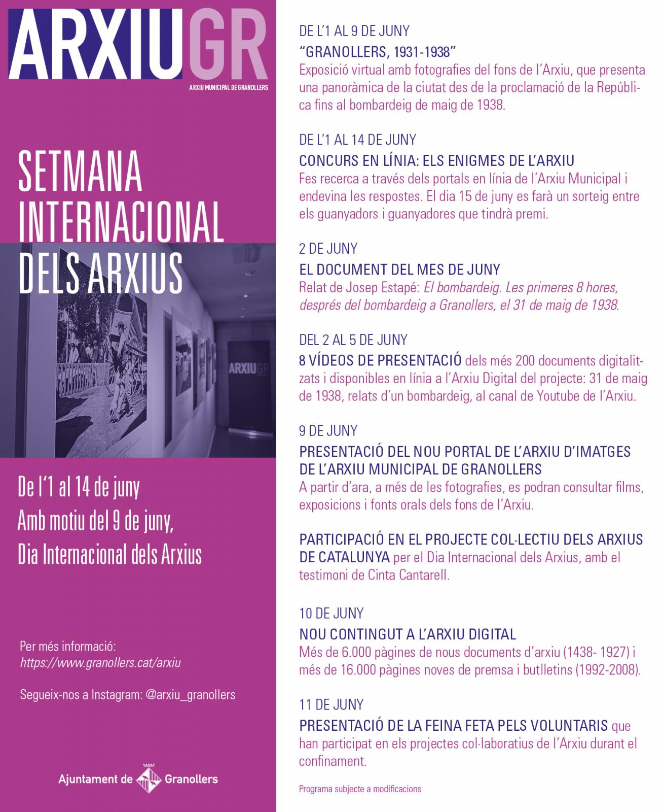 +Així, de l'1 al 9 de juny, el web https://www.granollers.cat/arxiu presenta la panoràmica «Granollers, 1931-1938», amb imatges que recullen des de la proclamació de la República fins al bombardeig de maig de 1938; i la secció del Document del Mes es dedica al relat de Josep Estapé: El bombardeig, en què l'autor narra les primeres vuit hores que van seguir el bombardeig del 31 de maig d'ara ha fet 82 anys. Durant aquesta setmana, el portal mostra vuit vídeos de presentació dels més 200 documents digitalitzats i disponibles en línia a l’arxiu digital del projecte: 31 de maig de 1938, relats d’un bombardeig, al canal de Youtube de l’Arxiu. I també es pot participar (fins al dia 14 de juny) al concurs en línia Els enigmes de l’Arxiu, on es plantegen un seguit de preguntes que es poden respondre fent recerca a través dels portals en línia de l’arxiu. El dia 15 de juny es farà un sorteig amb premi entre els guanyadors i guanyadores.