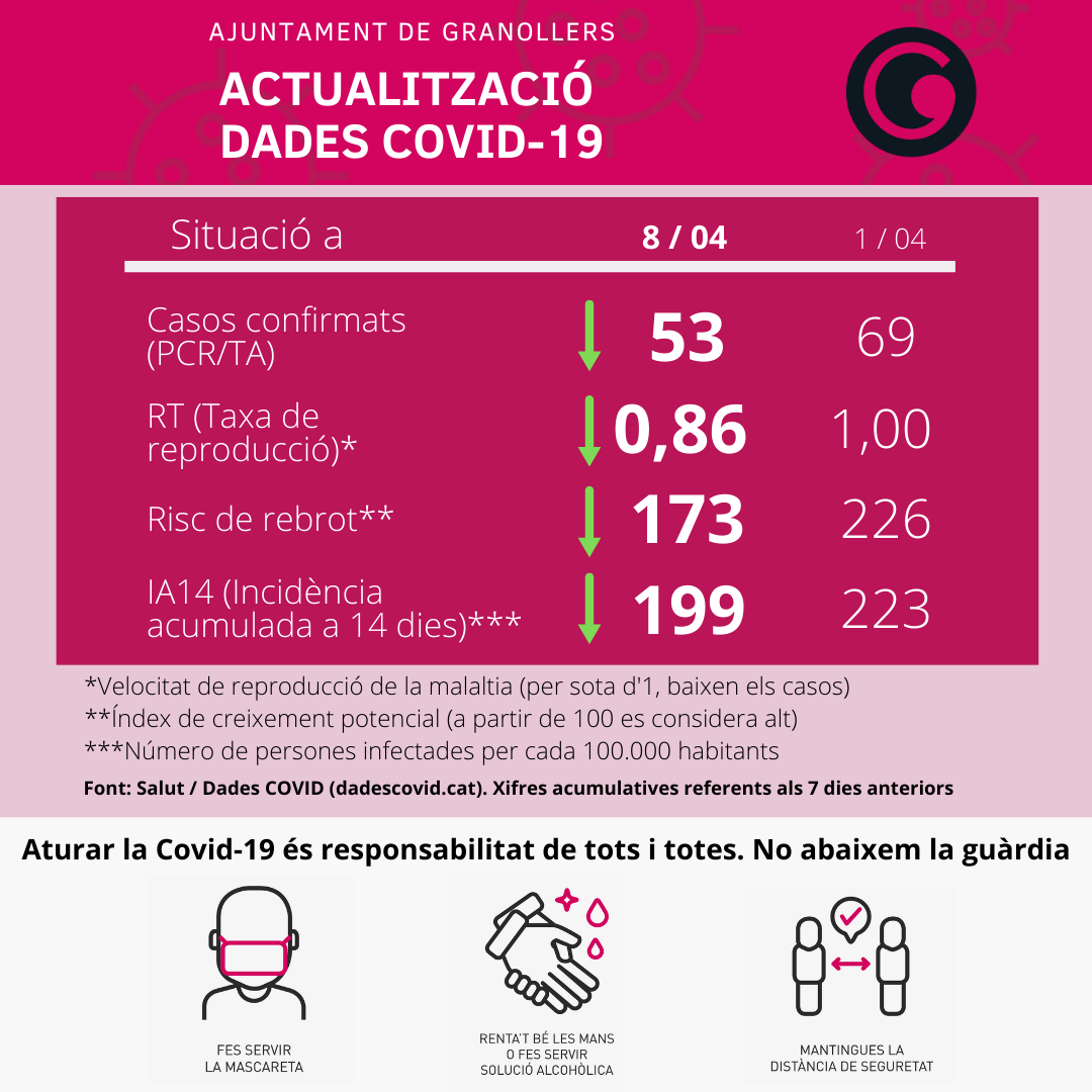 L’alcalde de Granollers, Josep Mayoral, ha presentat aquest divendres les dades d’evolució de la Covid-19 a la ciutat. A data d’avui, el risc de rebrot és de de 173 i la taxa de reproducció de 0,86. Josep Mayoral ha volgut destacar que són "dades atípiques, ja que encara no recullen les sortides i la interacció social de Setmana Santa". Normalment, en una setmana es fan 2.000 tests d’antígens o PCR a la ciutat, i durant la Setmana Santa només se’n van fer al voltant de 700, amb positivitat alta, d’un 8,46 %.