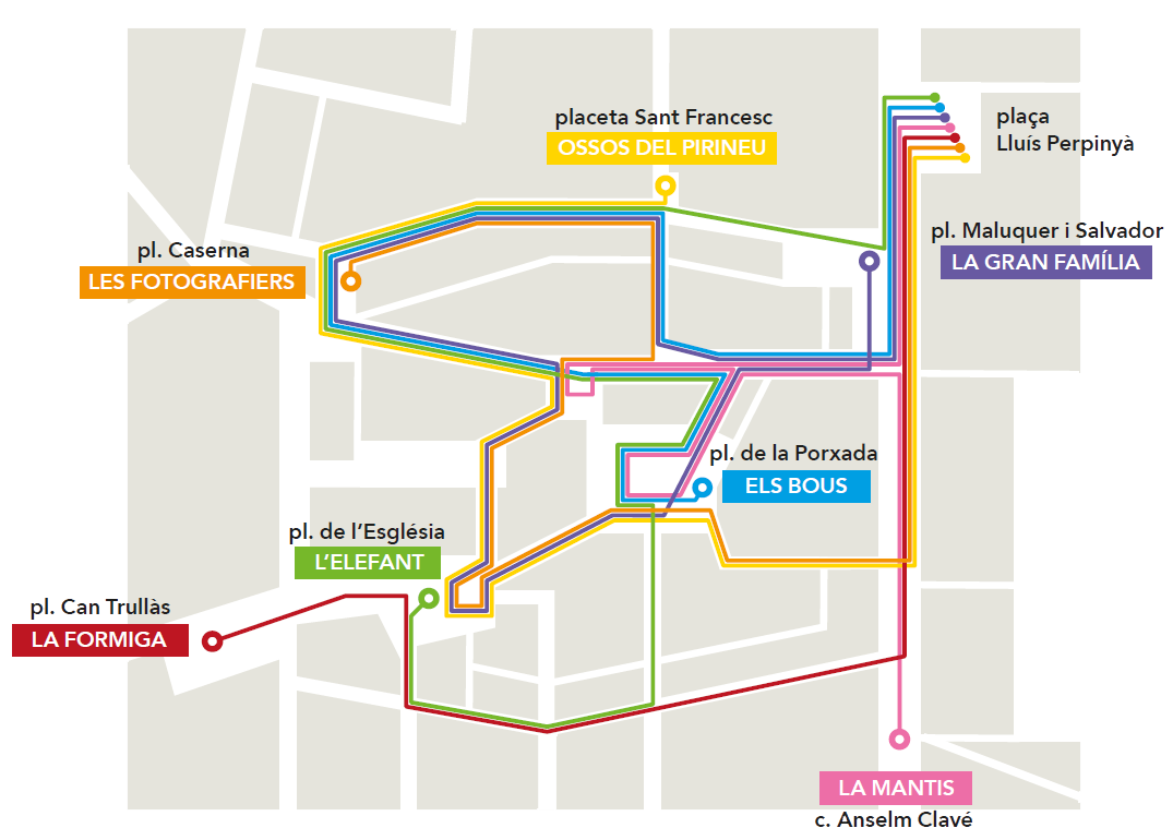 Durant tot el dissabte 27 s'exposaran els elements a les places de partida (11 h). A la tarda (18 h) es faran vuit recorreguts diferents que portaran els enginys a la plaça de Lluís Perpinyà. Tot seguit (19 h), tots els artistes desfilaran fins a la plaça de la Corona.