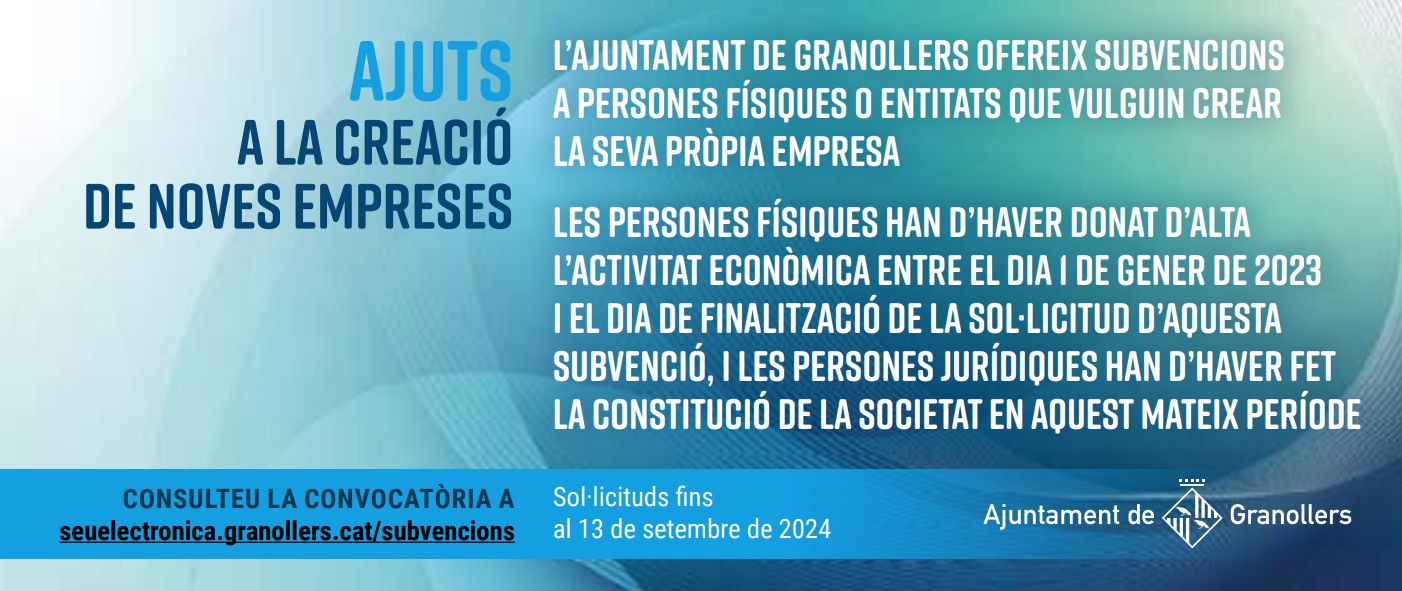 +Aquest dimecres 12 de juny l'Ajuntament de Granollers ha obert la convocatòria que permet subvencionar les empreses creades a Granollers entre el dia 1 de gener de 2023 i el 13 de setembre de 2024. D’aquesta manera, es pretén donar suport a noves iniciatives empresarials preferentment en el comerç, les indústries culturals i creatives i a les empreses cooperatives a Granollers. Aquestes subvencions serviran per cofinançar les despeses associades a la constitució, inici i manteniment de les noves empreses. La dotació de la convocatòria és de 80.000 €.
